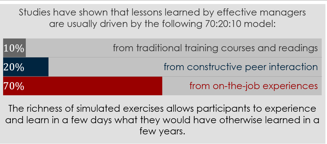 While most courses only contribute to the bottom 10%, experiential learning programs focus on providing realistic, risk-free competitive environments where participants learn through experience (the 70%) while also working in cross-functional and cross-market teams (the 20%).